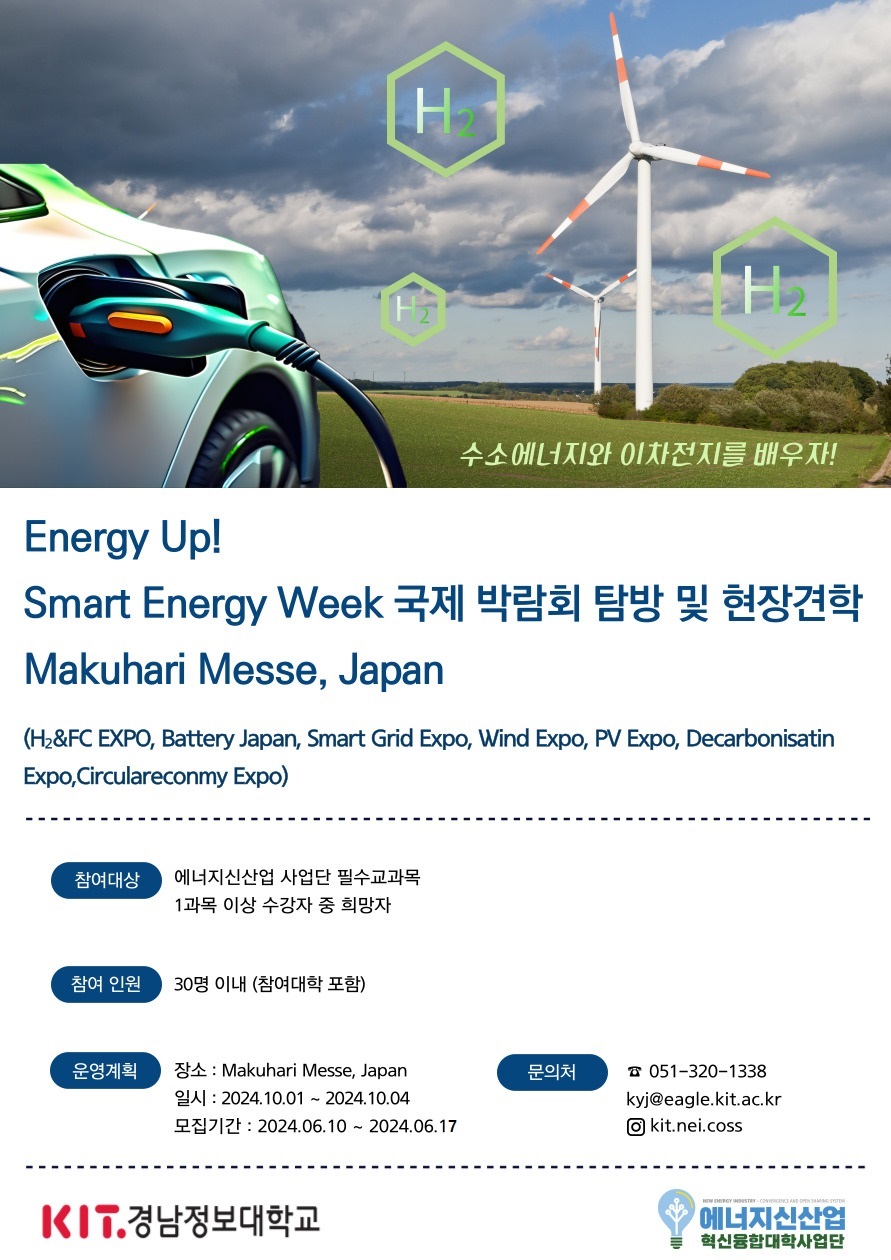 경남정보대학교 에너지신산업사업단에서 Energy Up! Smart Energy Week 국제 박람회 탐방 및 현장견학 프로그램을 진행합니다. 관심있는 재학생 여러분의 많은 신청 바랍니다.