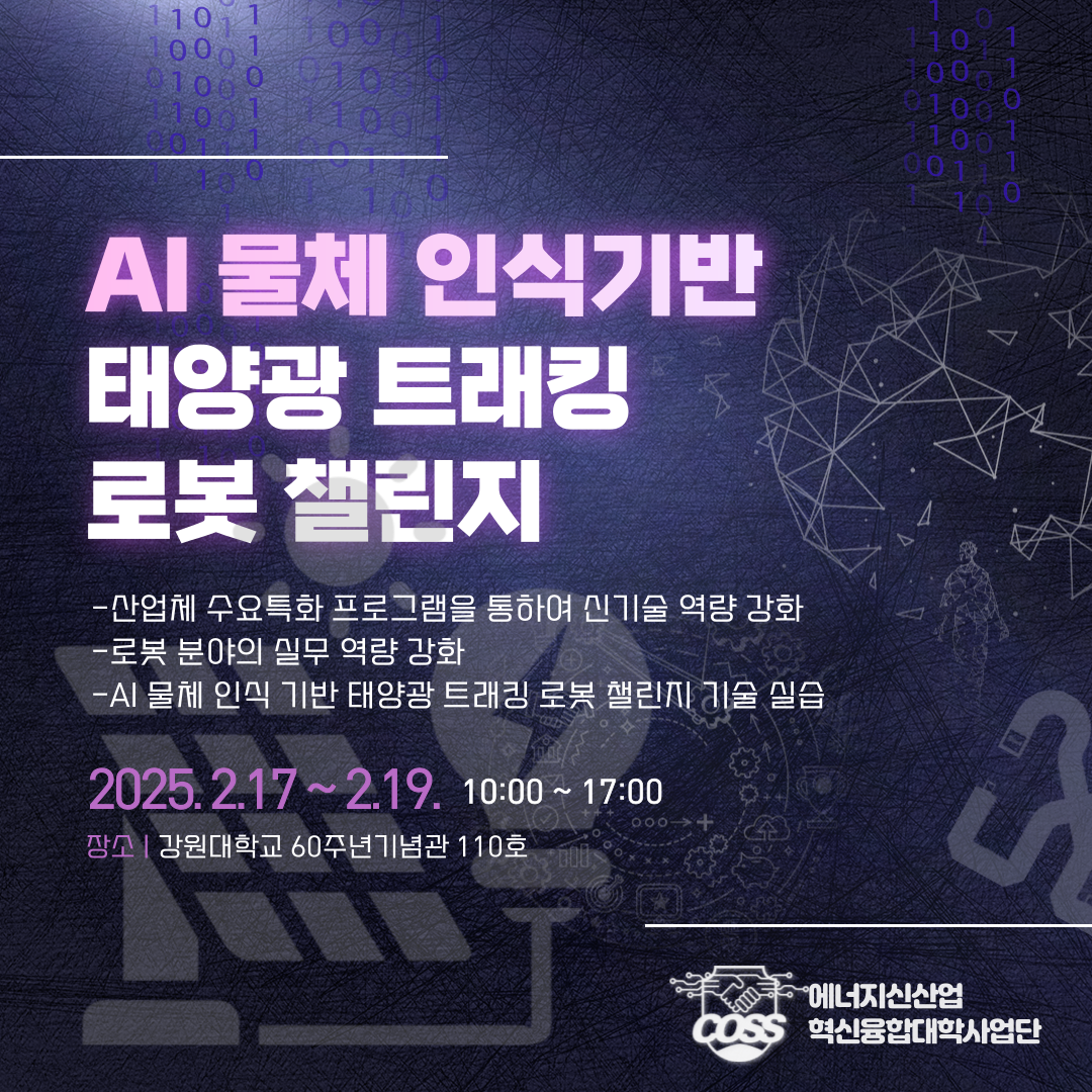 에너지신산업 혁신융합대학사업을 수행하는 강원대학교 에너지신산업 혁신융합대학 사업단에서 AI 물체 인식 기반 태양광 트래킹 로봇 챌린지 프로그램을 진행한다고 하니, 관심있는 여러분의 신청 바랍니다.