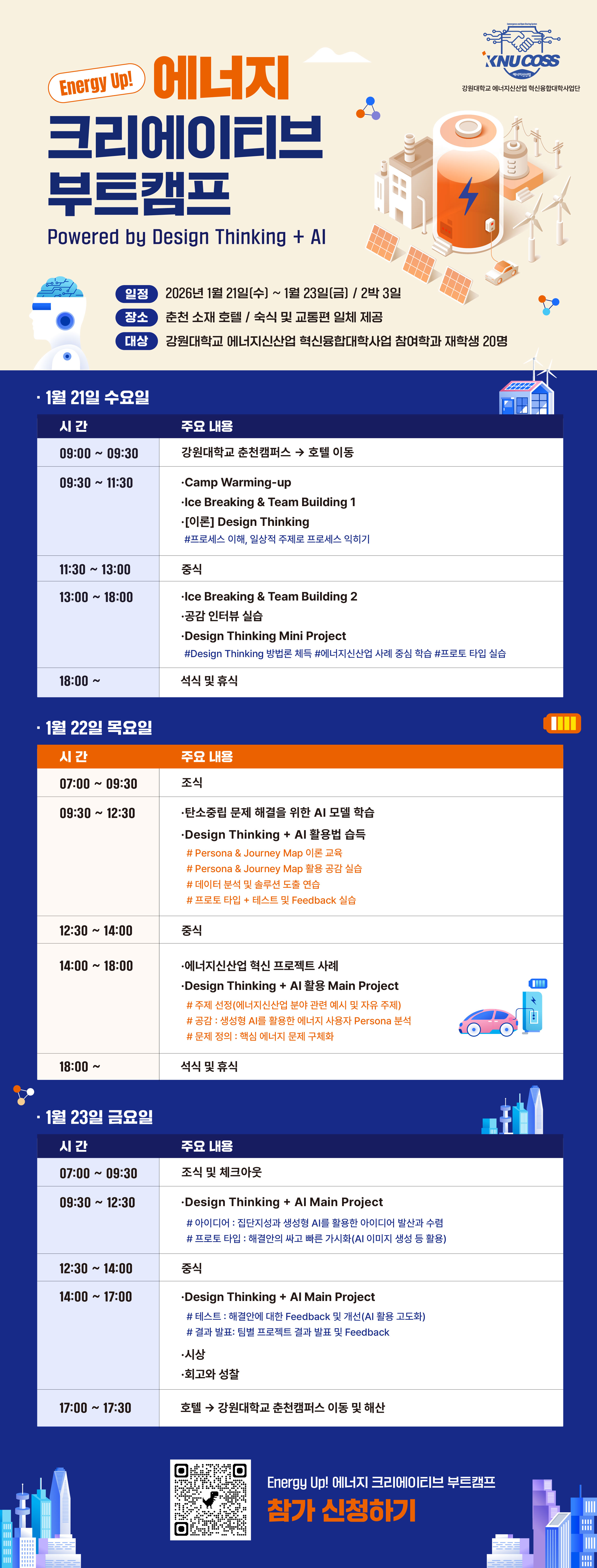 강원대학교 에너지신산업 혁신융합대학사업단에서 AI와의 협업을 통해 에너지신산업 분야 문제를 발견, 해결해 보는 경험을 체득할 수 있도록 2박 3일에 걸쳐 집중 훈련 교육 프로그램인 《Energy Up! 에너지 크리에이티브 부트캠프 powered by Design Thinking + AI》을 진행합니다. 관심있는 재학생 여러분의 많은 신청 바랍니다.